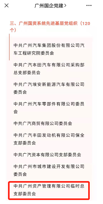 7月1日,在隆重庆祝中国共产党成立100周年之际,广州市国资委党委授予中共广州资产管理有限公司临时党总支部委员会“市国资系统先进基层党组织”荣誉称号。